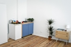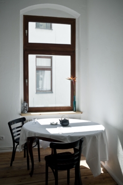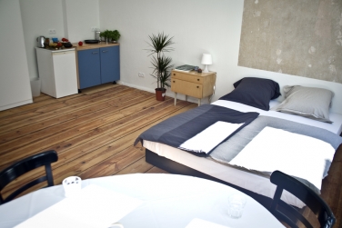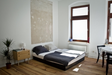 Das möblierte Zimmer mit eigener Kochgelegenheit (Herdplatten, Spüle und Kühlschrank) befindet sich in einer frisch sanierten, 2-Zimmer-Altbauwohnung im dritten Obergeschoss des Seitenflügels. Mit abgezogenen und geölten Dielen, verputzten und geweißelten Wänden, extrem hohen Decken und großen Fenstern bietet es eine behagliche Atmosphäre, die durch wenige ausgewählte Möbel wie einem großen und bequemen Hotelbett (160 x 200 cm), einem Tisch, zwei Stühlen und einem großen Schrank abgerundet wird.