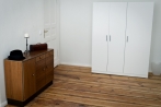 This fully furnished room with its own cooking space (hotplates, sink and fridge) is part of a 2-bedroom apartment on the fourth floor in a side wing of an old turn-of-the-century building. With hardwood, oil finished floors, white stucco walls, extremely high ceilings and large windows it instantly offers a pleasant atmosphere rounded up by selected pieces of furniture such as a queen-size bed, a table, two chairs, and a wardrobe.
